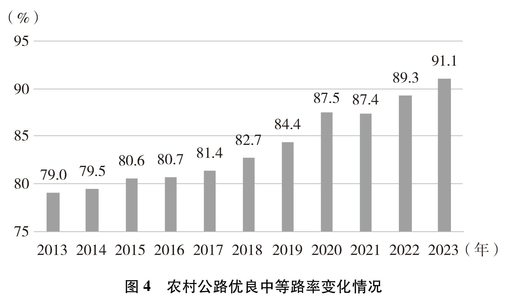 (注4)“优良中等路率”是指评定结果为优等、良等和中等的比例。按《公路技术状况评定标准》,公路技术状况划分为优、良、中、次、差五个评定等级。