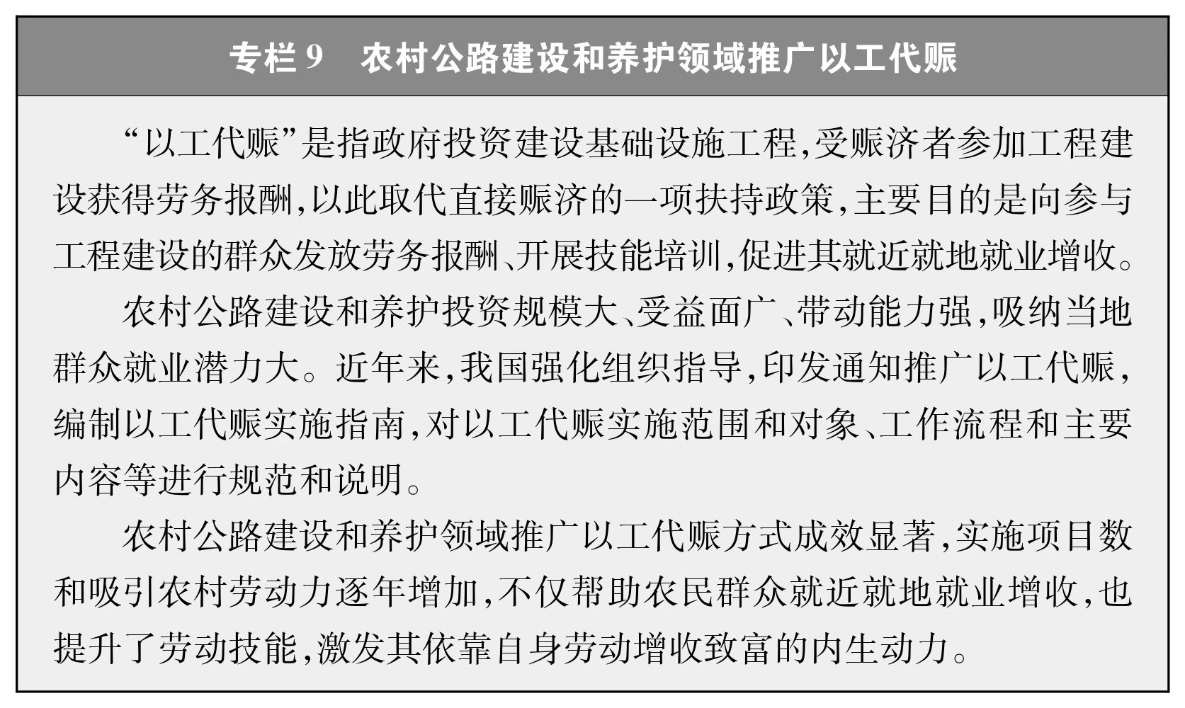 农村地区交通条件的持续改善吸引资本、项目和人才向农村流动,创造更多就业机会,拓宽农民群众致富增收渠道。各地还通过农村公路建设项目以工代赈(专栏9)、开发农村公路公益性岗位等方式进一步拓宽农民群众就业渠道,实现农民群众就近就地就业增收。目前,农村公路建设项目以工代赈方式年吸纳农村劳动力约8万人,人均年增收约8500元;农村公路管理与养护领域提供就业岗位约85万个,人均年收入约1.3万元。