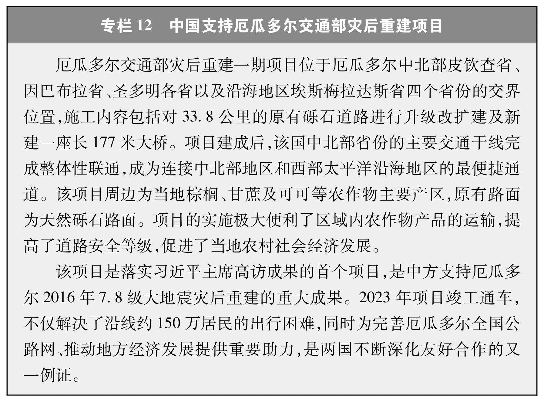 中国积极支持并参与发展中国家的农村公路建设项目,在其他发展中国家援建了大批农村公路基础设施项目,向世界农村公路领域分享中国方案、中国经验。通过参与项目建设、提供凯发天生赢家一触即发的技术支持和人力资源,帮助当地改善农村地区道路基础条件(专栏12),极大方便当地人民出行,大幅度降低物流成本,增强城乡互动,促进当地农产品的流通和市场接入,对消减贫困、改善民生、提升人民群众的生活水平,促进当地经济社会发展具有重要意义,深受当地百姓好评,如中国无偿援建的马达加斯加首都郊区公路项目,便利了马哈扎扎镇鸡蛋运输,促进了当地蛋鸡养殖业发展,这条路被当地人亲切地称作“鸡蛋路”。