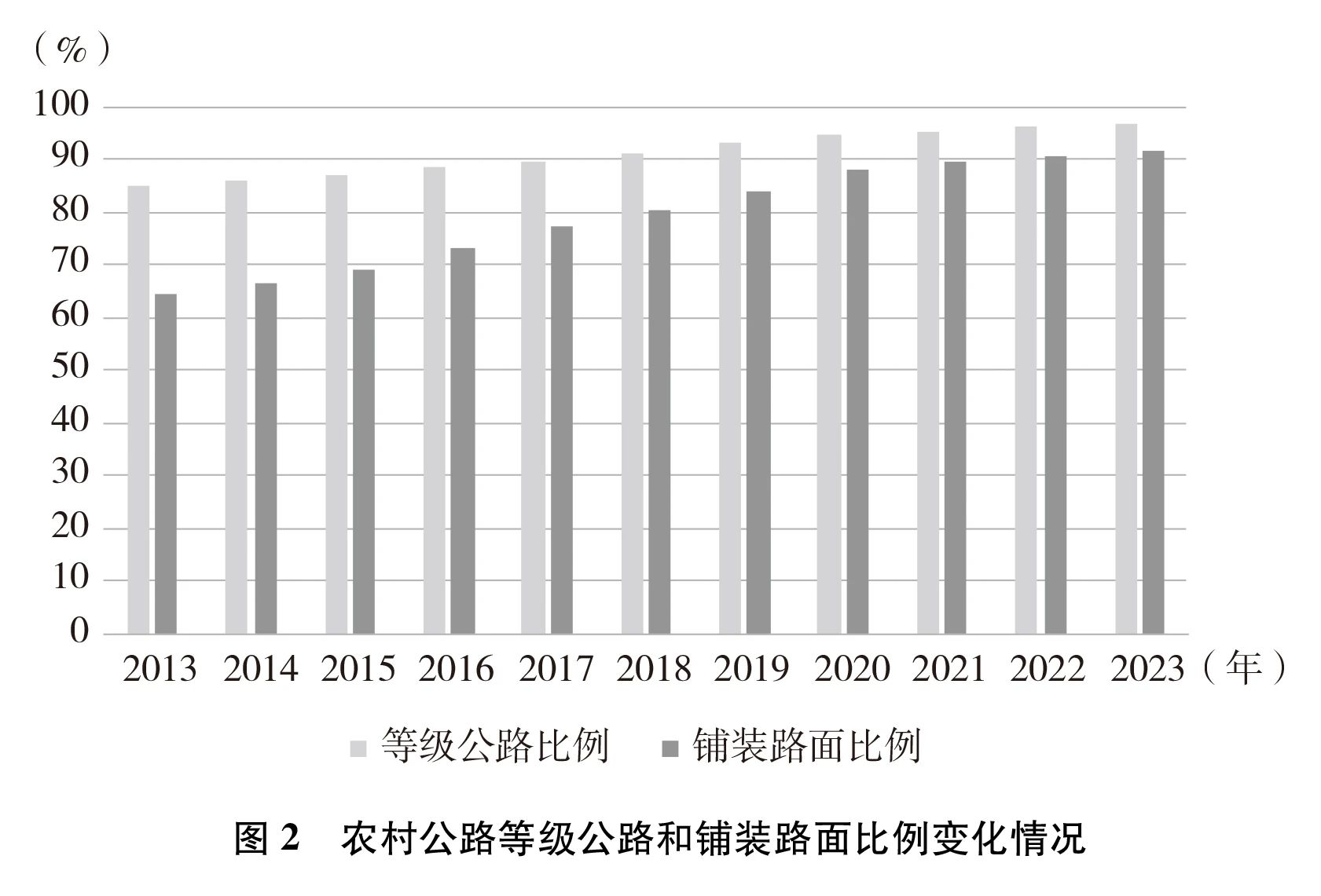 技术等级逐年提高。截至2023年底,农村公路等级路(注2)里程及比例分别达到445万公里和96.8%,铺装路面里程及比例分别达到422万公里和91.8%,十年间分别提高了11.9个百分点、27.2个百分点。