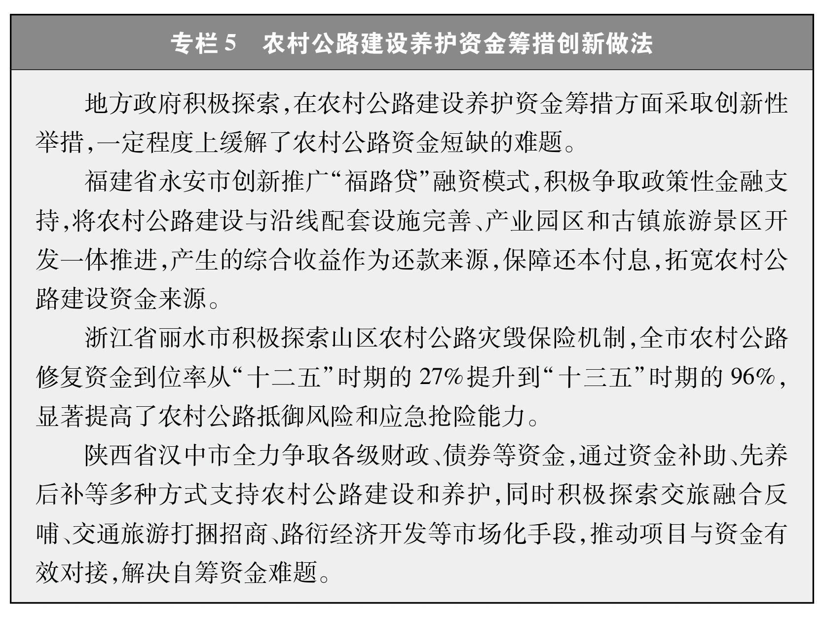 利用多元化市场融资方式拓宽融资渠道。充分发挥市场融资机制在农村公路发展中的重要作用,积极拓宽资金来源渠道。各地区结合实际,通过将农村公路与产业、园区、乡村旅游等经营性项目实行一体化开发等方式创新“农村公路 ”投融资模式(专栏5)。通过将农村公路管养纳入政府购买服务指导性目录,探索农村公路灾毁保险等方式支持农村公路养护。鼓励各类金融机构依法合规加大对符合条件的农村公路建设的支持力度。十年来,全国累计使用各类金融机构信贷资金约8000亿元用于农村公路发展。
