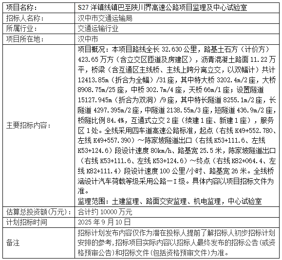 s27洋镇线镇巴至陕川界高速公路项目监理及中心试验室