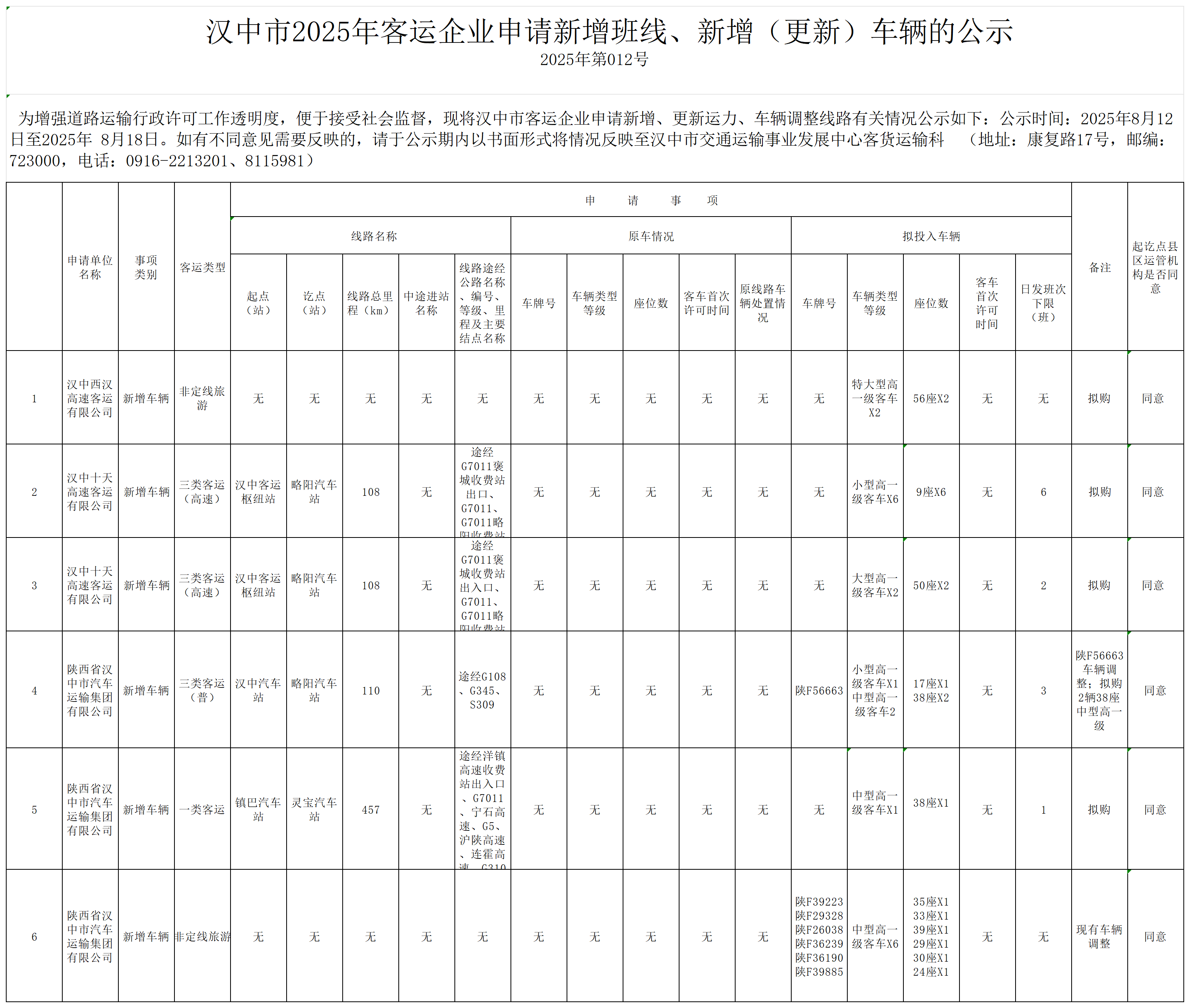 汉中市2025年客运企业申请新增班线、新增(更新)车辆的公示2025年第12号