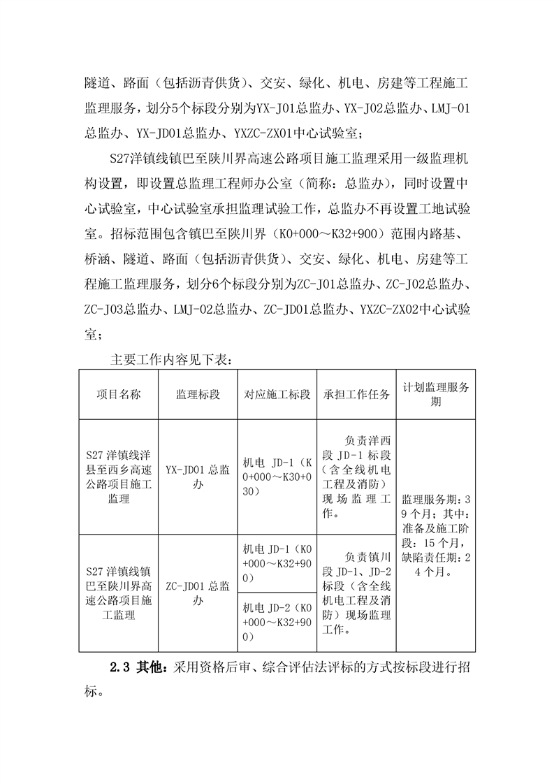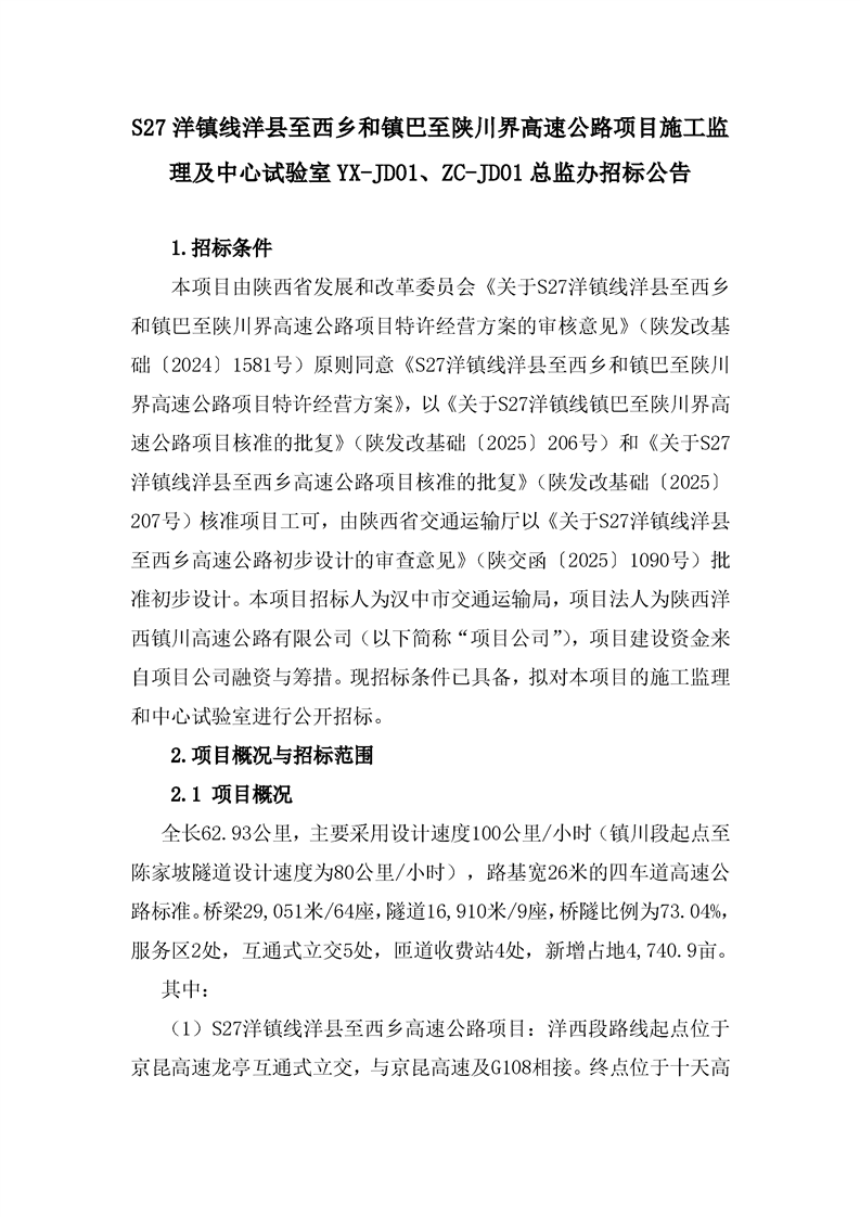s27洋镇线洋县至西乡和镇巴至陕川界高速公路项目施工监理及中心试验室yx-jd01、zc-jd01总监办招标公告