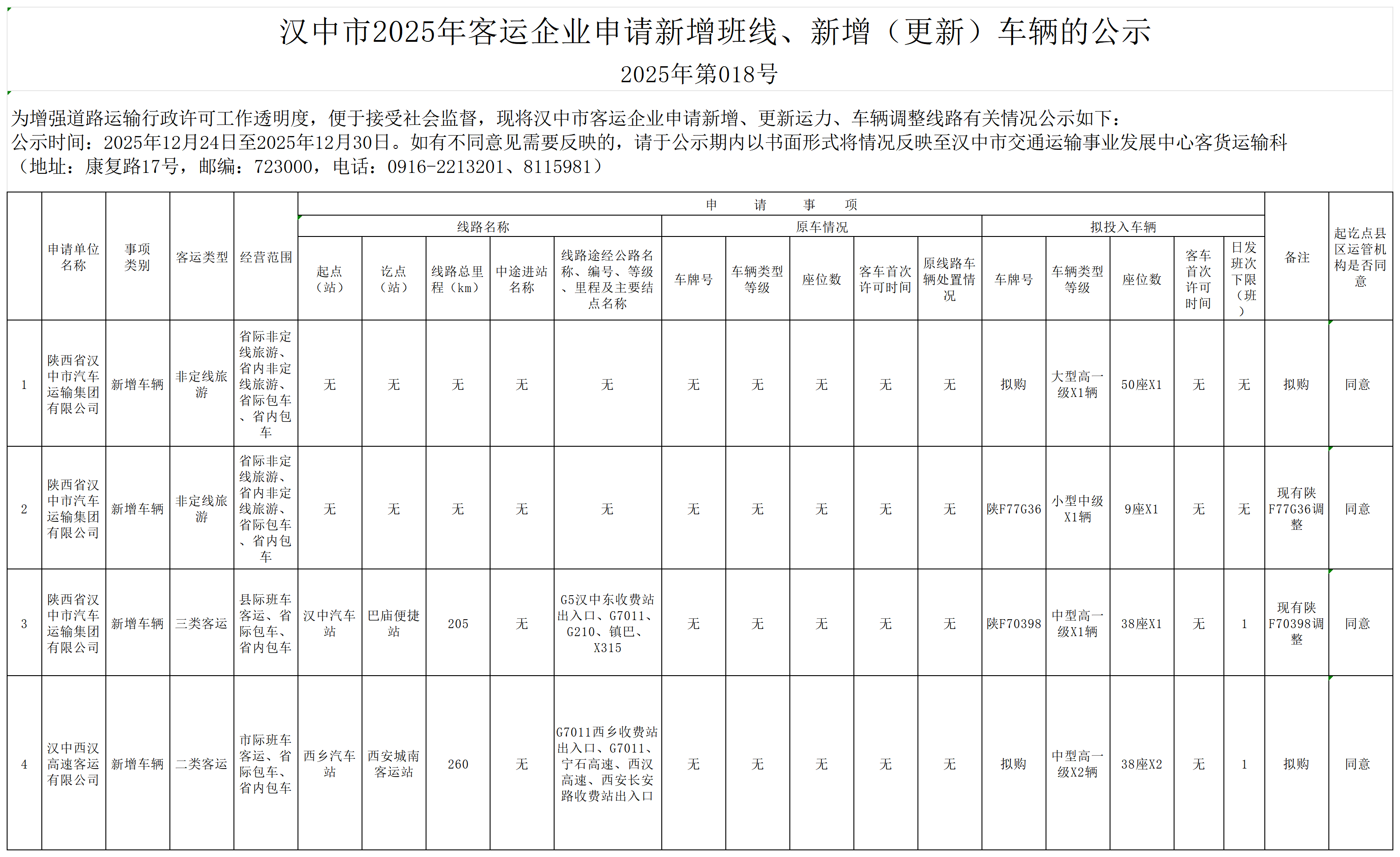 汉中市2025年客运企业申请新增班线、新增(更新)车辆的公示2025年第018号