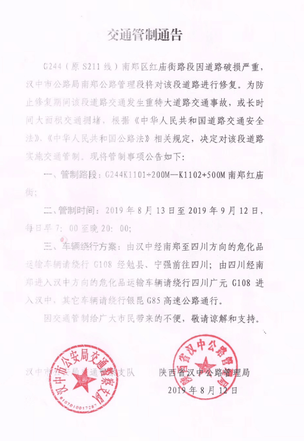 g244南郑区红庙街路段k1101 200m-k1102 500m因道路破损严重,汉中公路局南郑公路管理段将对该路段进行修复并交通管制。管制时间2019年8月13日至2019年9月12日每日早上7:00到晚上20:00.由汉中经南郑至四川方向的危化品车辆请绕行g108经勉县,宁强前往四川;由四川经南郑进入汉中方向的危化品车辆请绕行四川广元g108进入汉中,其他车辆请绕行银昆g85高速公路。