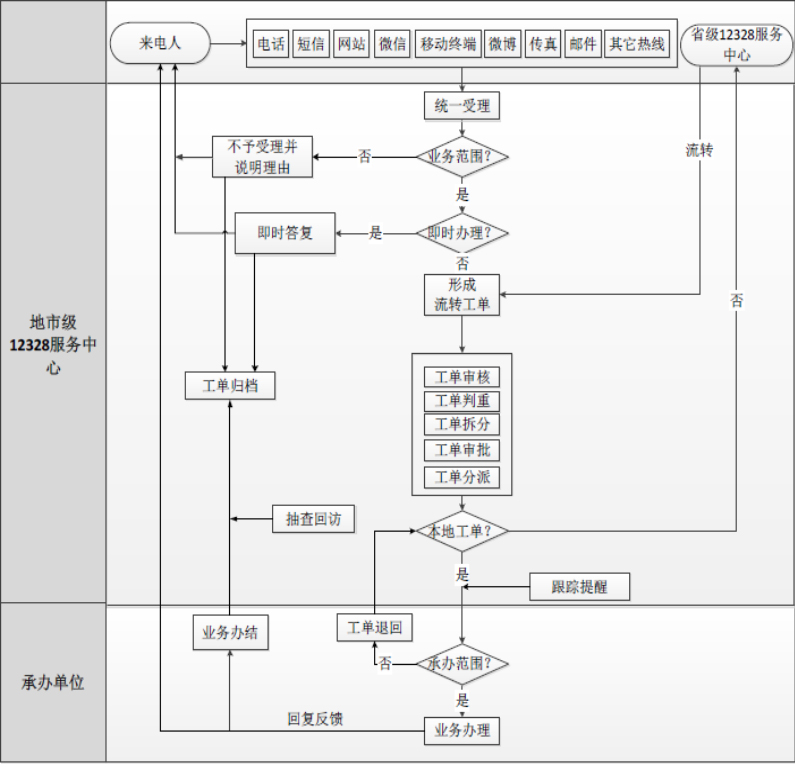 陕西12328电话设省、市两级服务中心,采取全省集中与区域结合的受理方式,未开通12328电话的地区来电由省级12328服务中心集中受理;设立市12328服务中心的地区来电由其市级中心自行受理。省级12328主要承担非现金业务、高速公路业务,经营性一、二级普通公路业务;市级12328主要承担本行政区域内的道路运输、城市客运、政府还贷一级普通公路、海事、水路、救助打捞及其它业务。