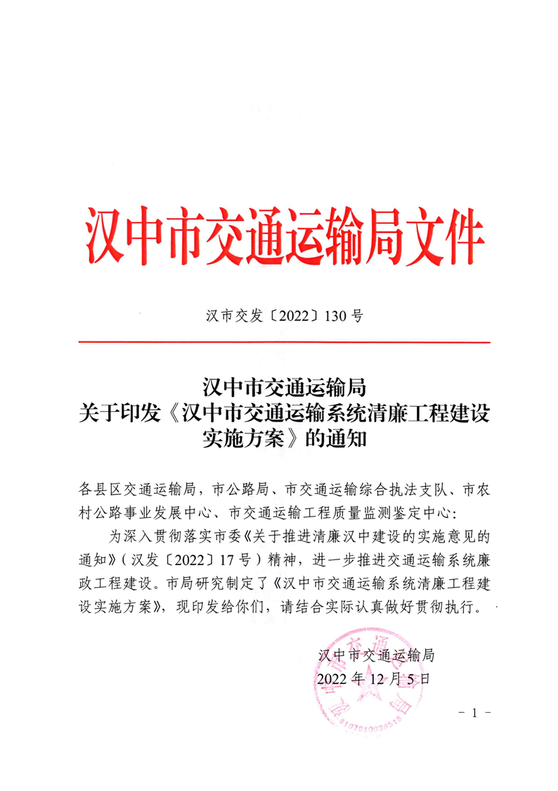 汉中市交通运输局关于印发《汉中市交通运输系统清廉工程建设实施方案》的通知
