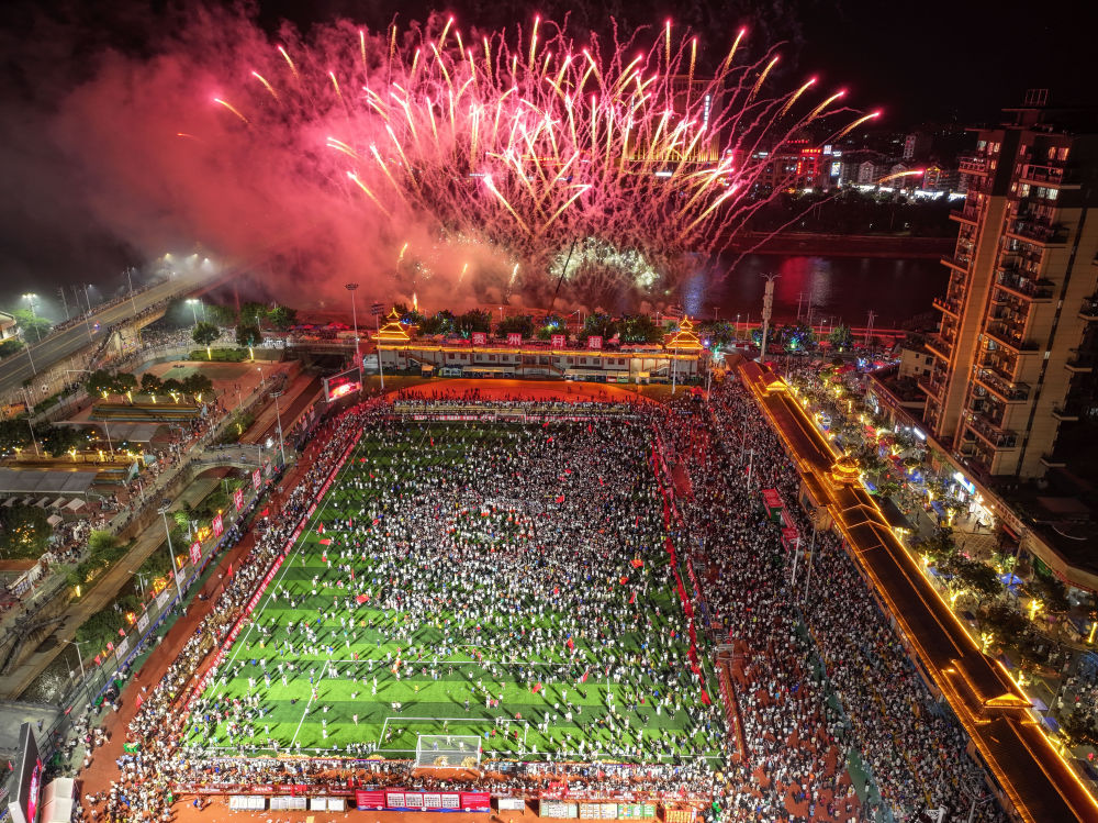 7月26日,贵州“村超”球场拍摄的烟花秀(无人机照片)。当日,贵州榕江举行主题为“感恩重启·贵州超力量”的超级星期六活动,球星巴乔、卡洛斯现场助阵,助力“村超”重燃赛事,正式回归。新华社记者杨文斌摄