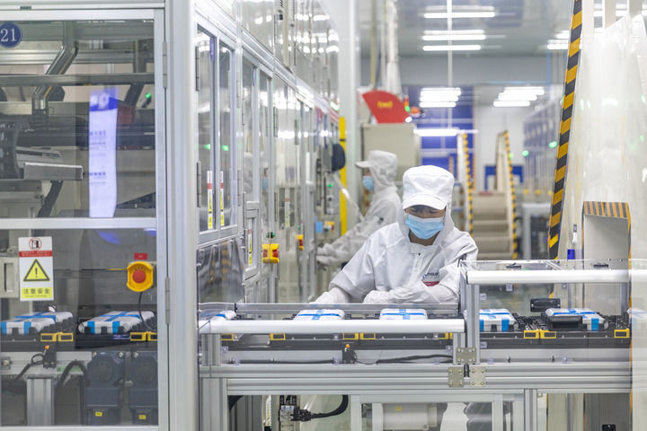 2024年9月27日,在位于重庆市铜梁区的海辰储能重庆制造基地,工作人员在生产线上初步检测两个电芯是否配对。新华社记者黄伟摄