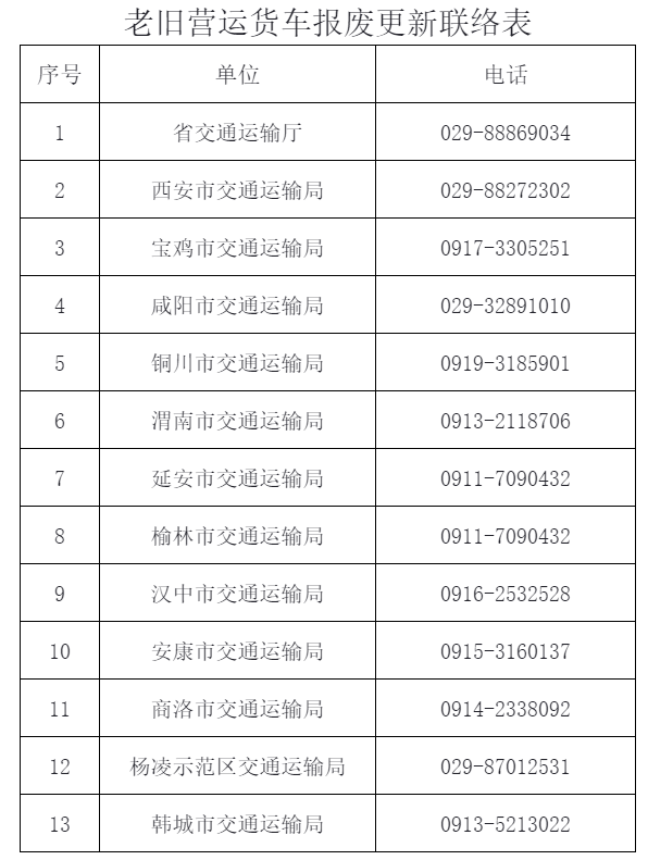 为贯彻落实《交通运输部 国家发展改革委 财政部关于实施老旧营运货车报废更新的通知》(交规划发〔2025〕17号)《交通运输部办公厅国家发展改革委办公厅公安部办公厅财政部办公厅商务部办公厅关于印发2025年老旧营运货车报废更新工作实施细则的通知》(交办运〔2025〕12号)文件精神,全力推动我省老旧营运货车报废更新工作,结合我省实际,联合省发展和改革委员会、省公安厅、省财政厅制定《陕西省2025年老旧营运货车报废更新工作实施细则》(陕交函〔2025〕361号),现将省市交通运输部门电话予以公布,具体办理流程可联系辖区交通运输部门进行咨询。