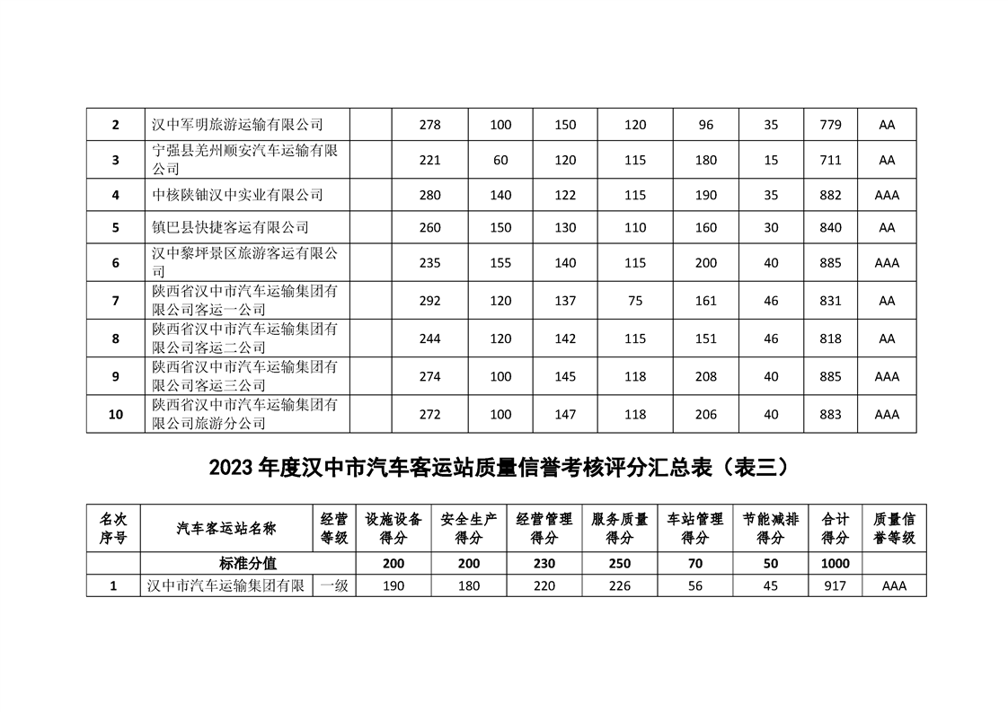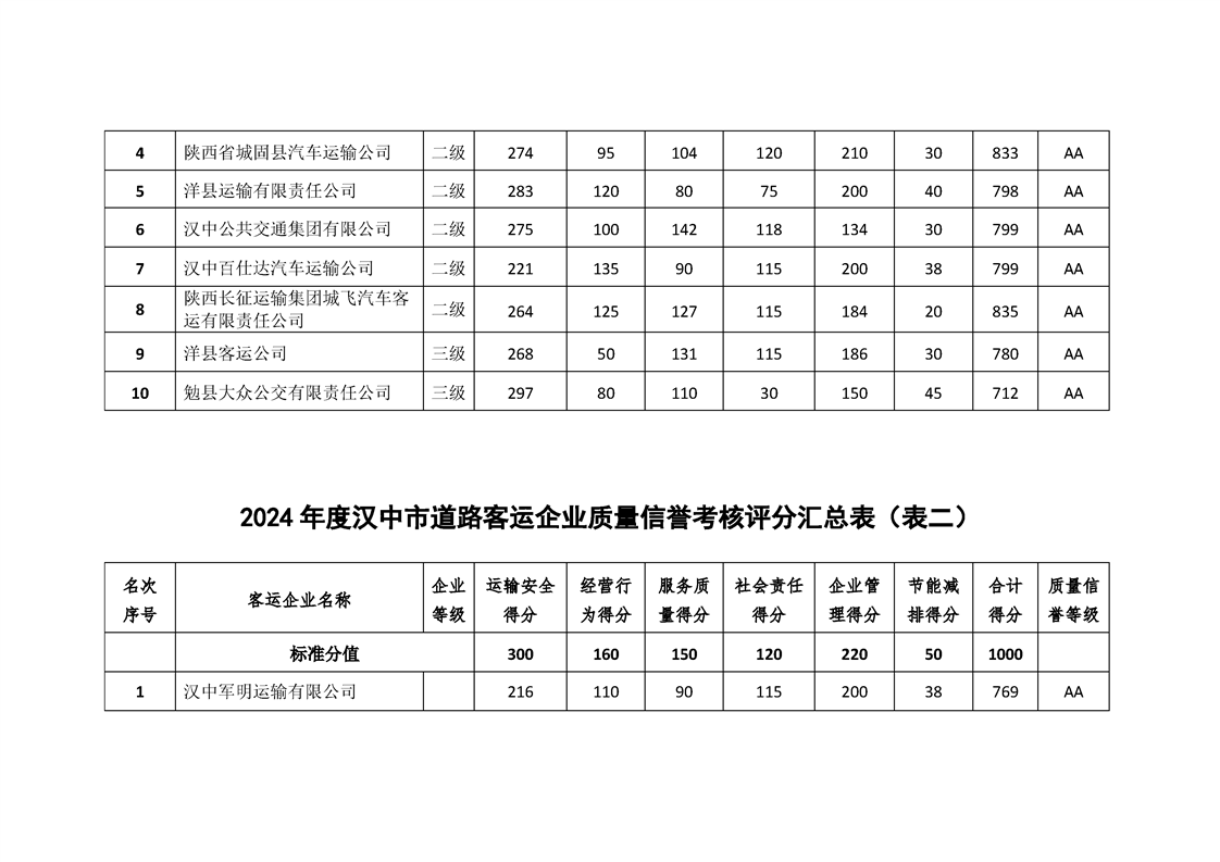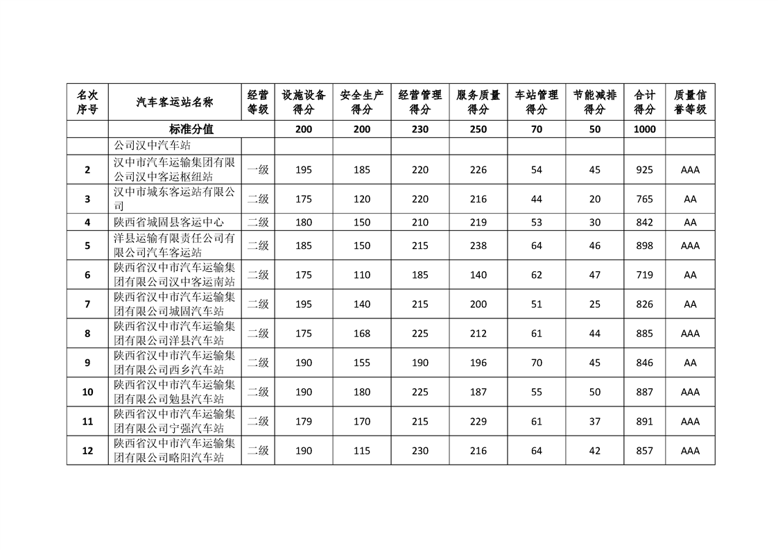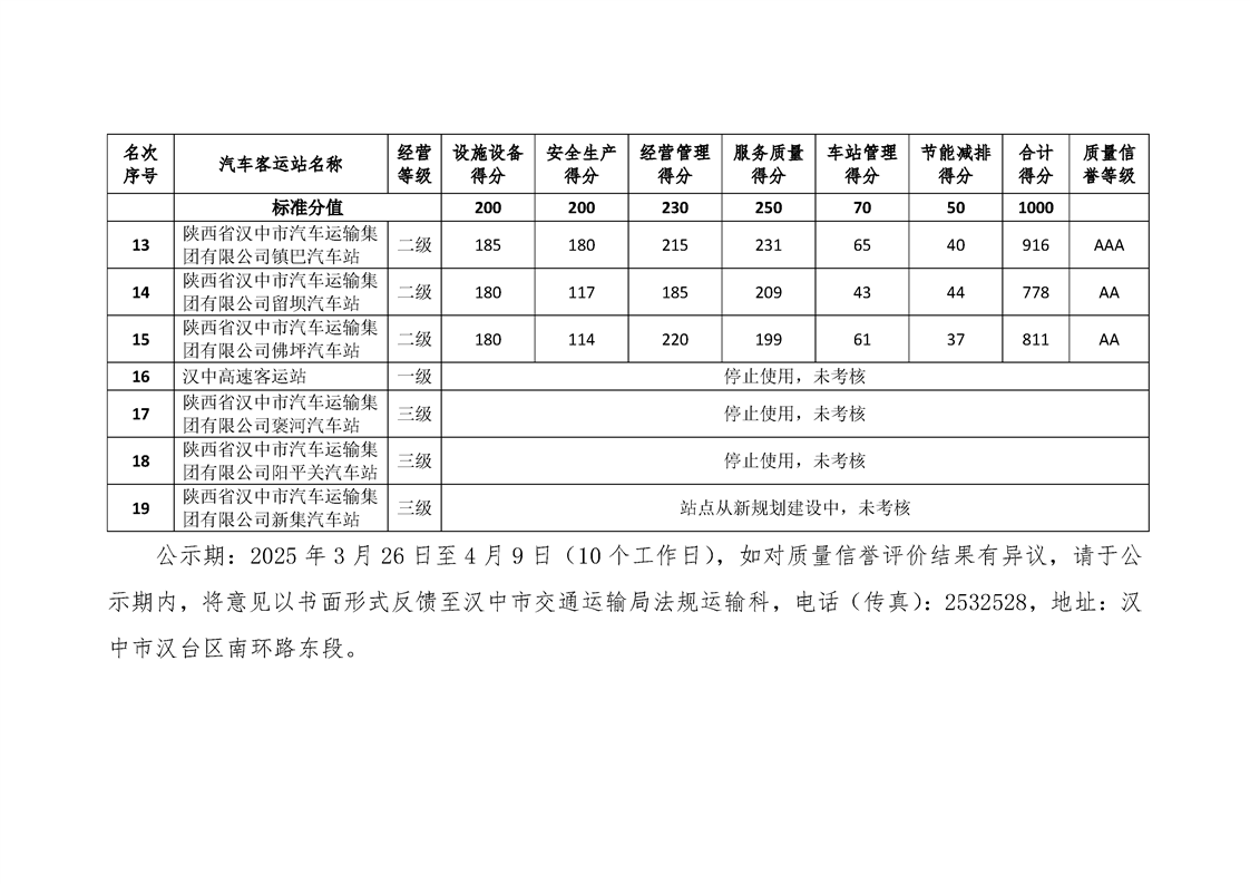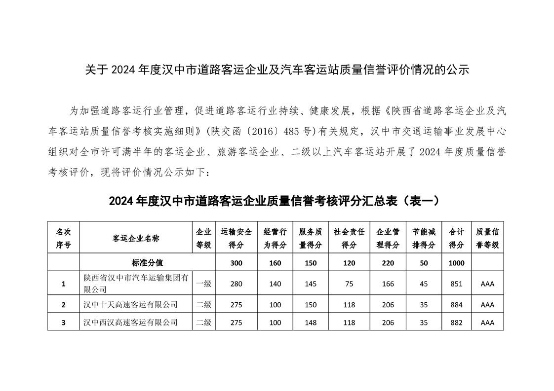 关于2024年度汉中市道路客运企业及汽车客运站质量信誉评价情况的公示