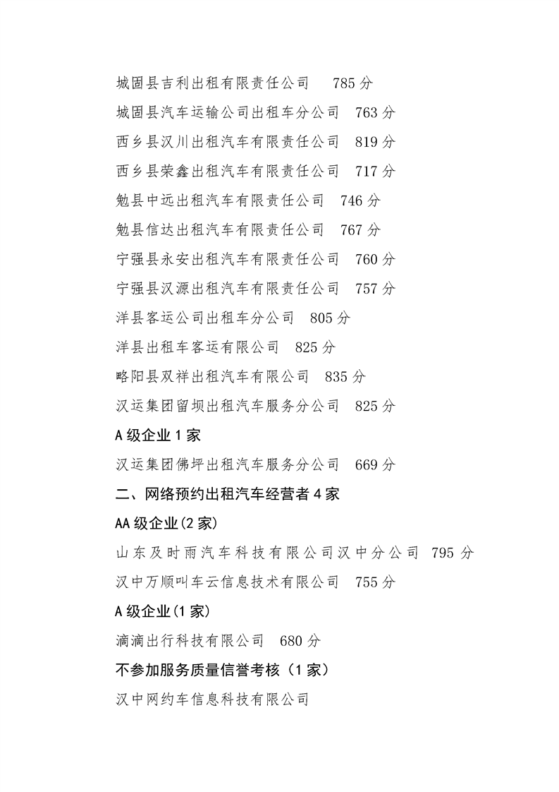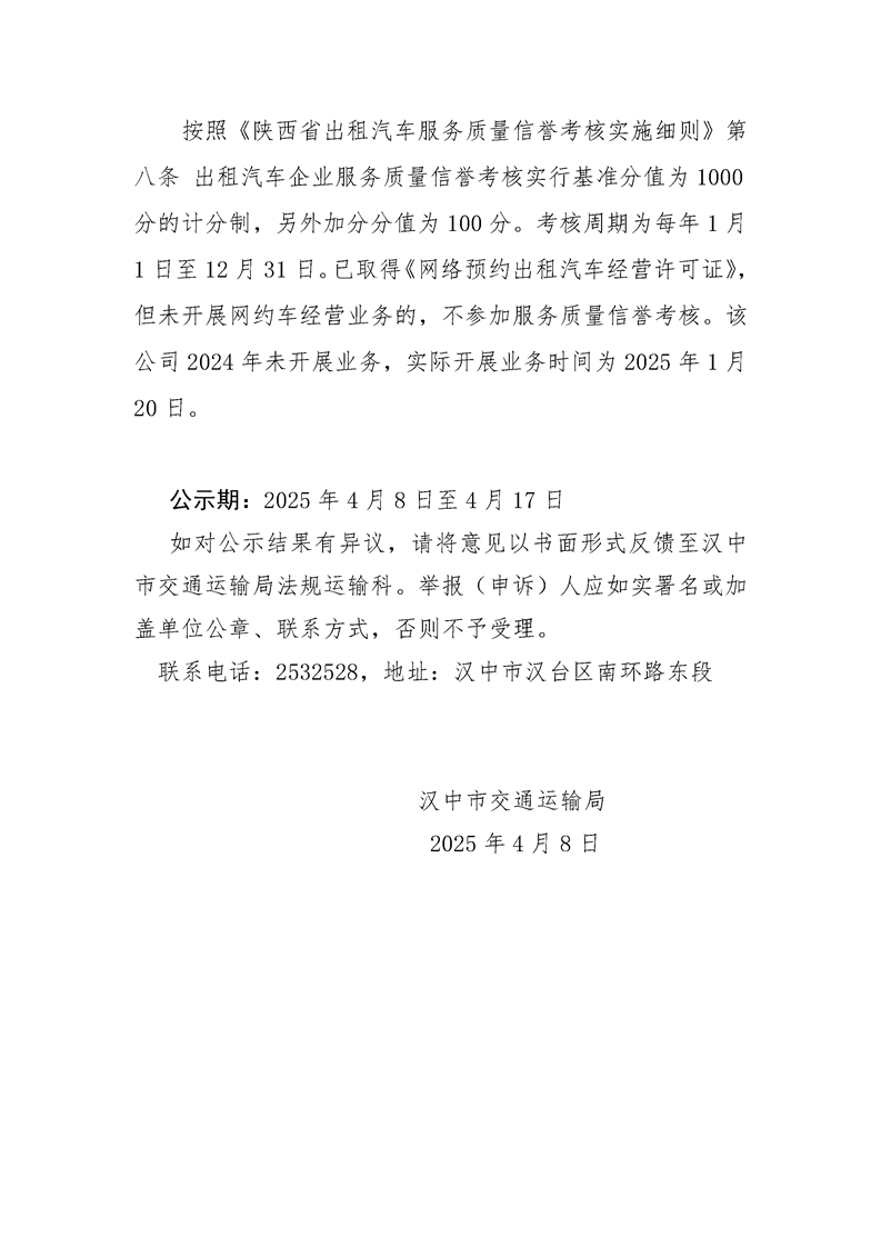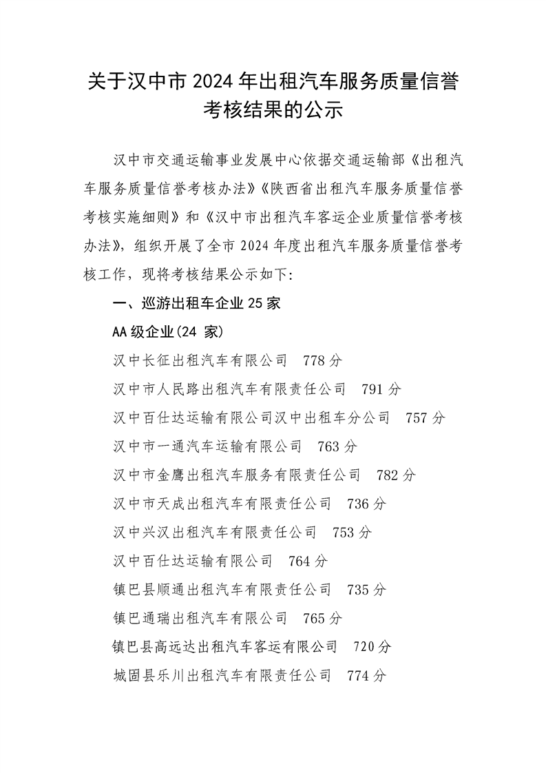 关于汉中市2024年出租汽车服务质量信誉考核结果的公示